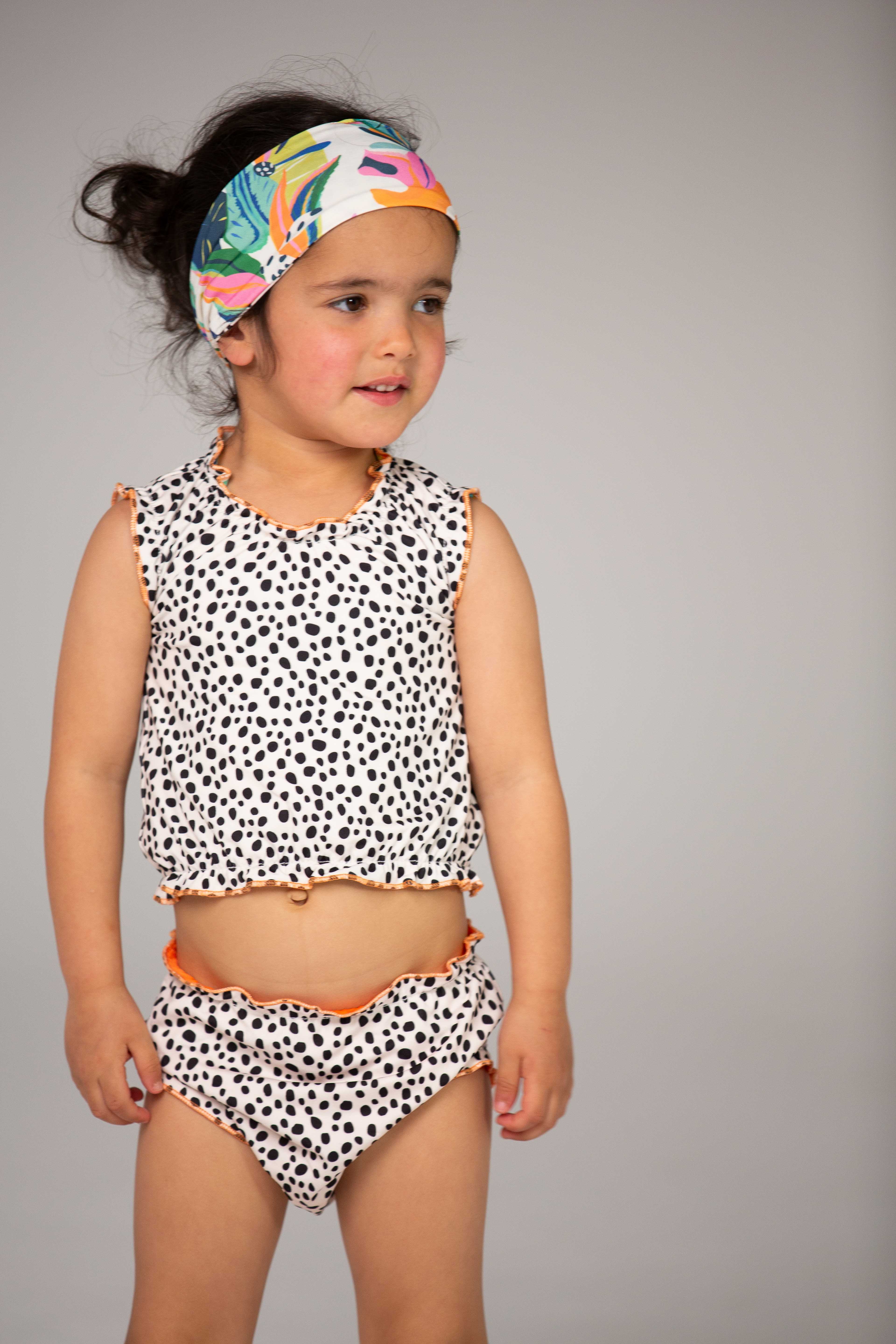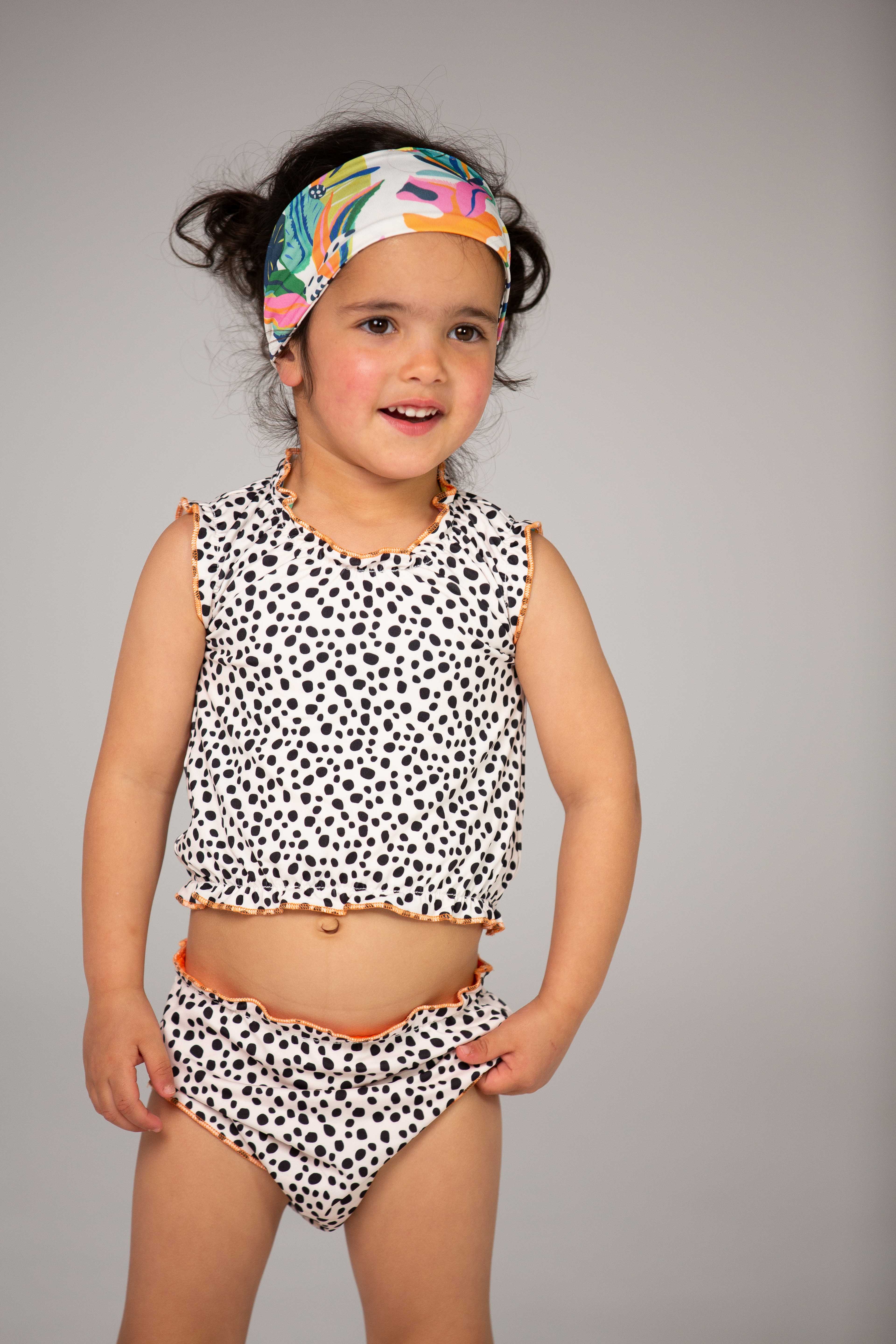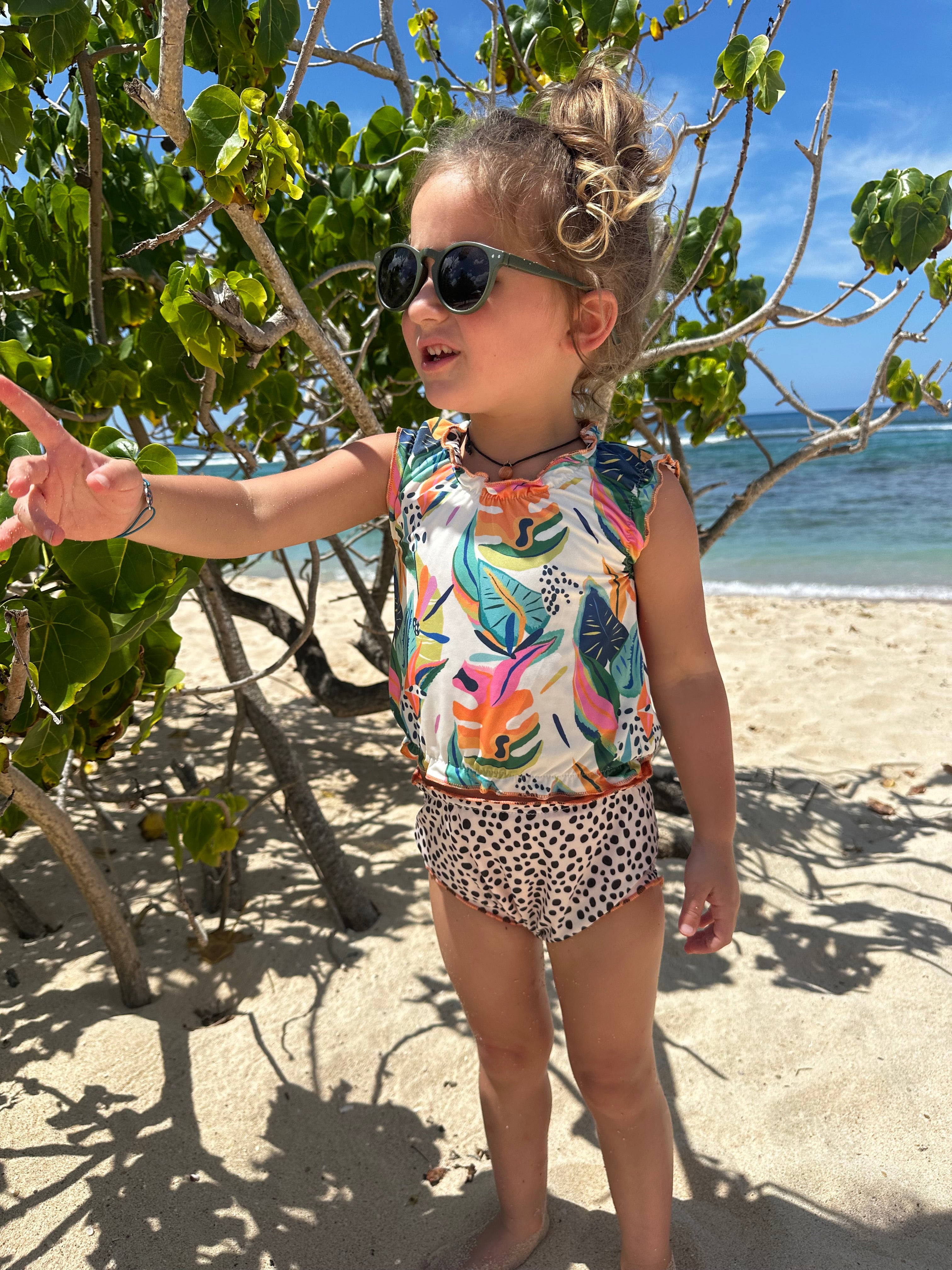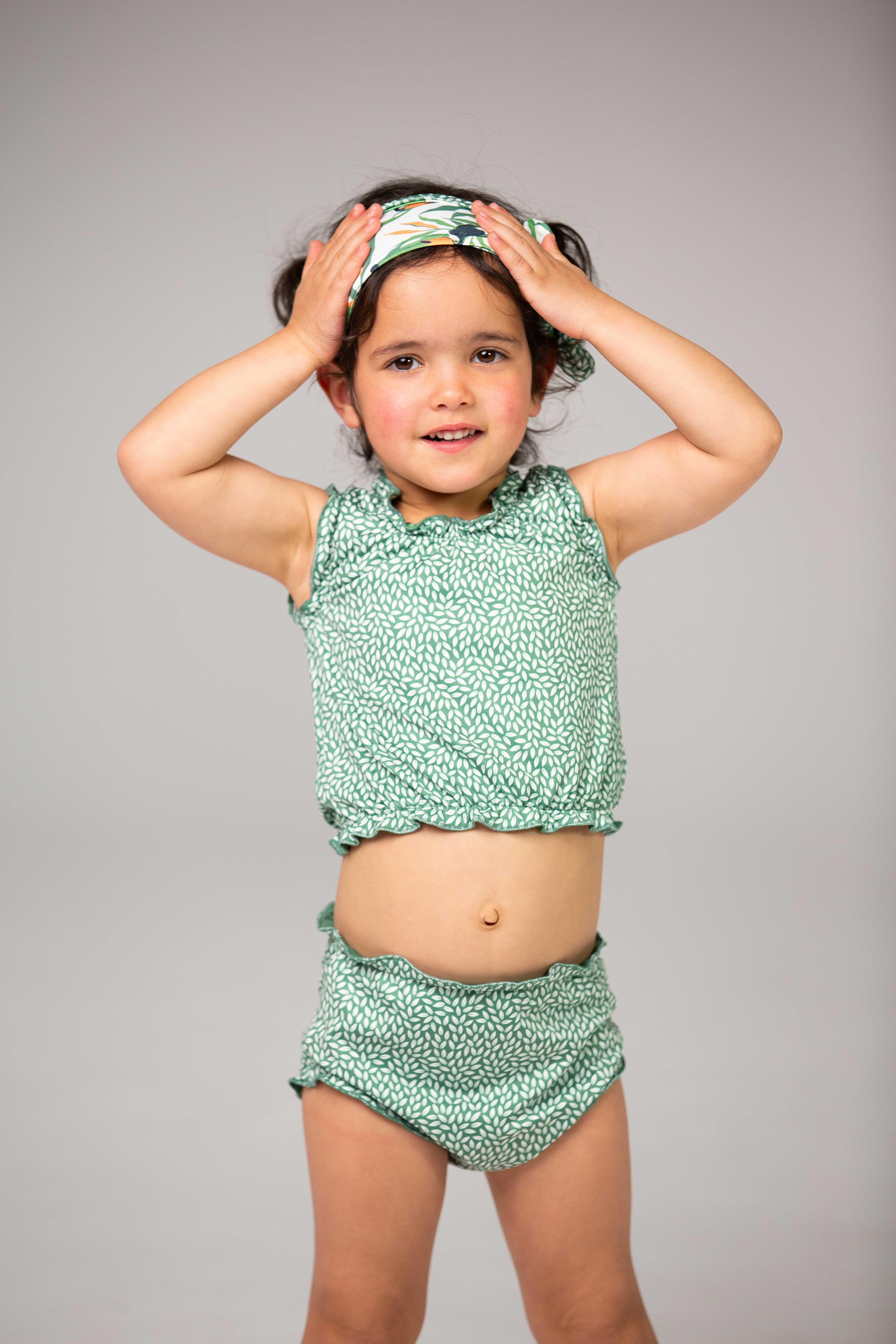 The latest cute tankini for babies and girls up to 4 years old can be worn on two sides and comes with a cute matching headband. The two-piece swimming suit has a high protection factor of 50+, even in wet conditions. You can wear the top, bottom and headband on two sides and combine them to your heart's content. Made of quick-dry material so don't get cold after a refreshing splash! The tankini in stretch fabric is also resistant to fresh and salt water and chlorine. The tankini is tested on harmful substances so you can wear it without worries!